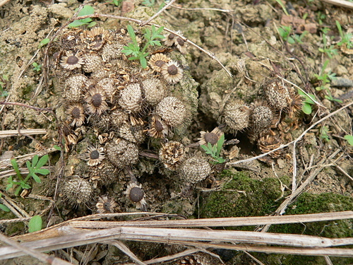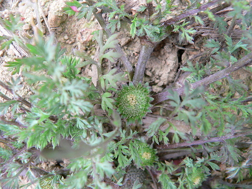 一年生小草本,莖葉綠色,平舖地上,分枝多。高不超過10公分,一莖生有3-4葉,狀如小號胡蘿蔔葉,長約6-7公分,二回羽狀,有深裂,裂片呈線形。頭花著生於短莖上,簇生莖腋,無柄,扁球形,色黃綠,總苞片綠色。瘦果褐色。