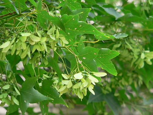 楓香的雄花是葇荑花序,雌花是頭狀花序,果實的形狀就像『流星鎚』。槭樹類的花是圓錐或聚繖花序,五個花瓣,果實是兩兩成對,還長著長長的翅膀以便利散播到更遠的地方,青楓為『翅果』。