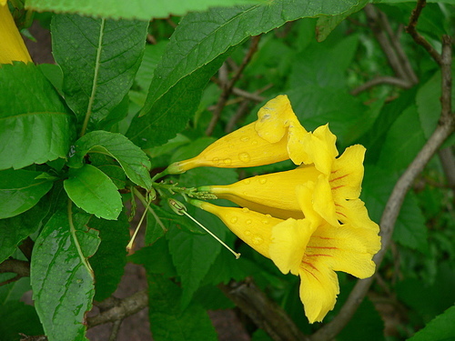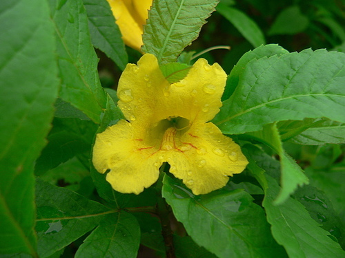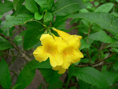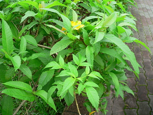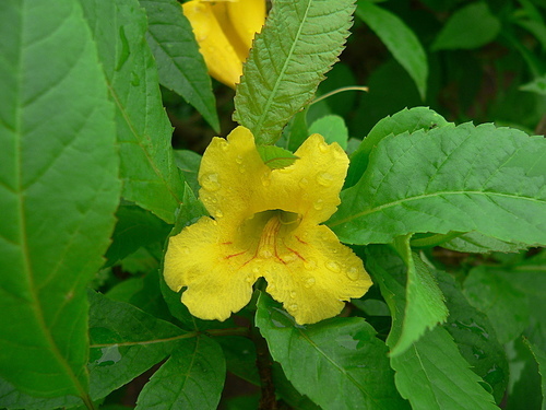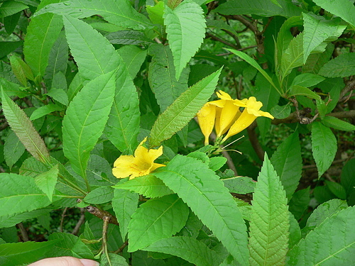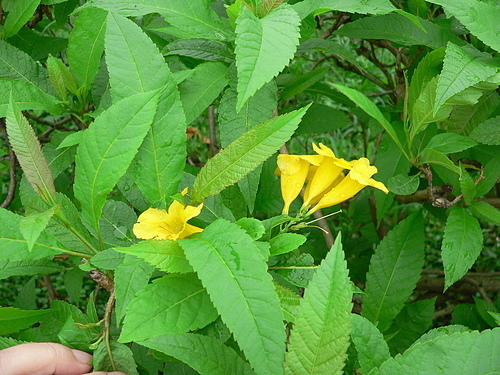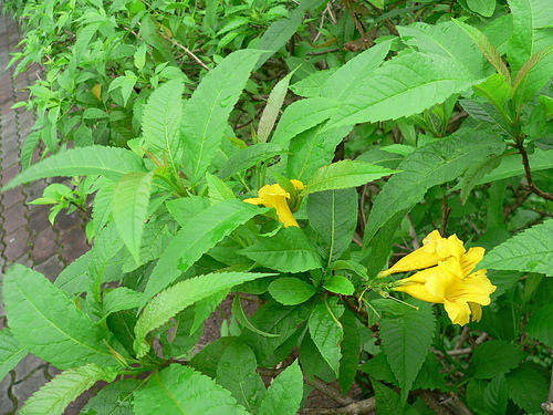 回家上網查一查,才知是灌木的黃鐘花。葉型不同,容易辨識。