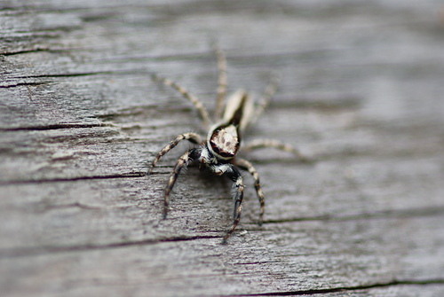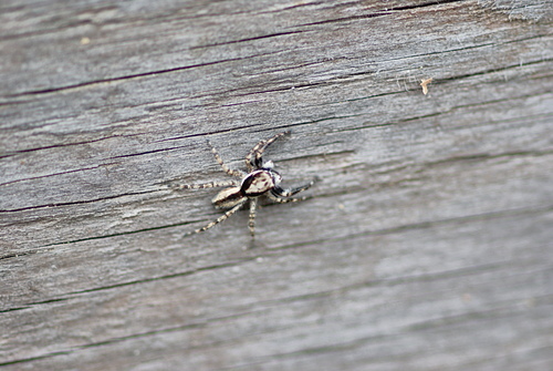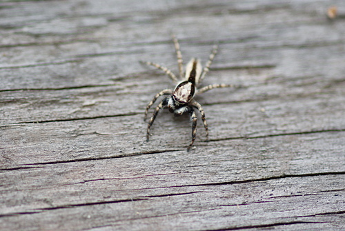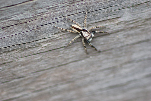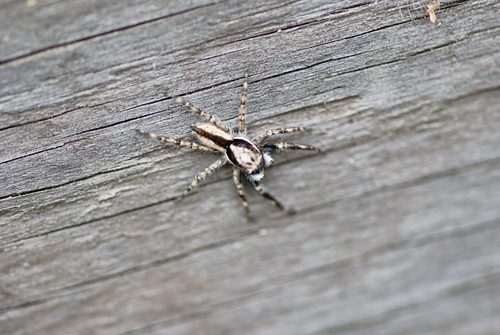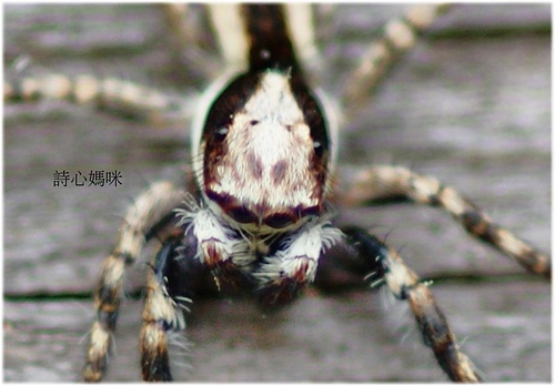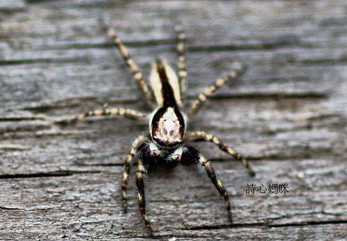 白鬚扁蠅虎(雄) 腹背中央有一條黑色縱帶,前中眼間白色